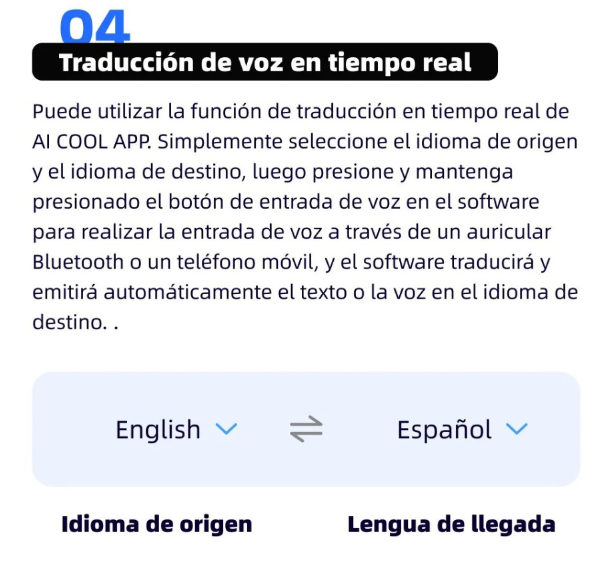 El Auricular Traductor IA utiliza tecnología de vanguardia para ofrecer resultados exactos y confiables. Gracias a la inteligencia artificial, comprende tus conversaciones en diversos idiomas, reduciendo errores de traducción y garantizando una comunicación clara, rápida y natural.
